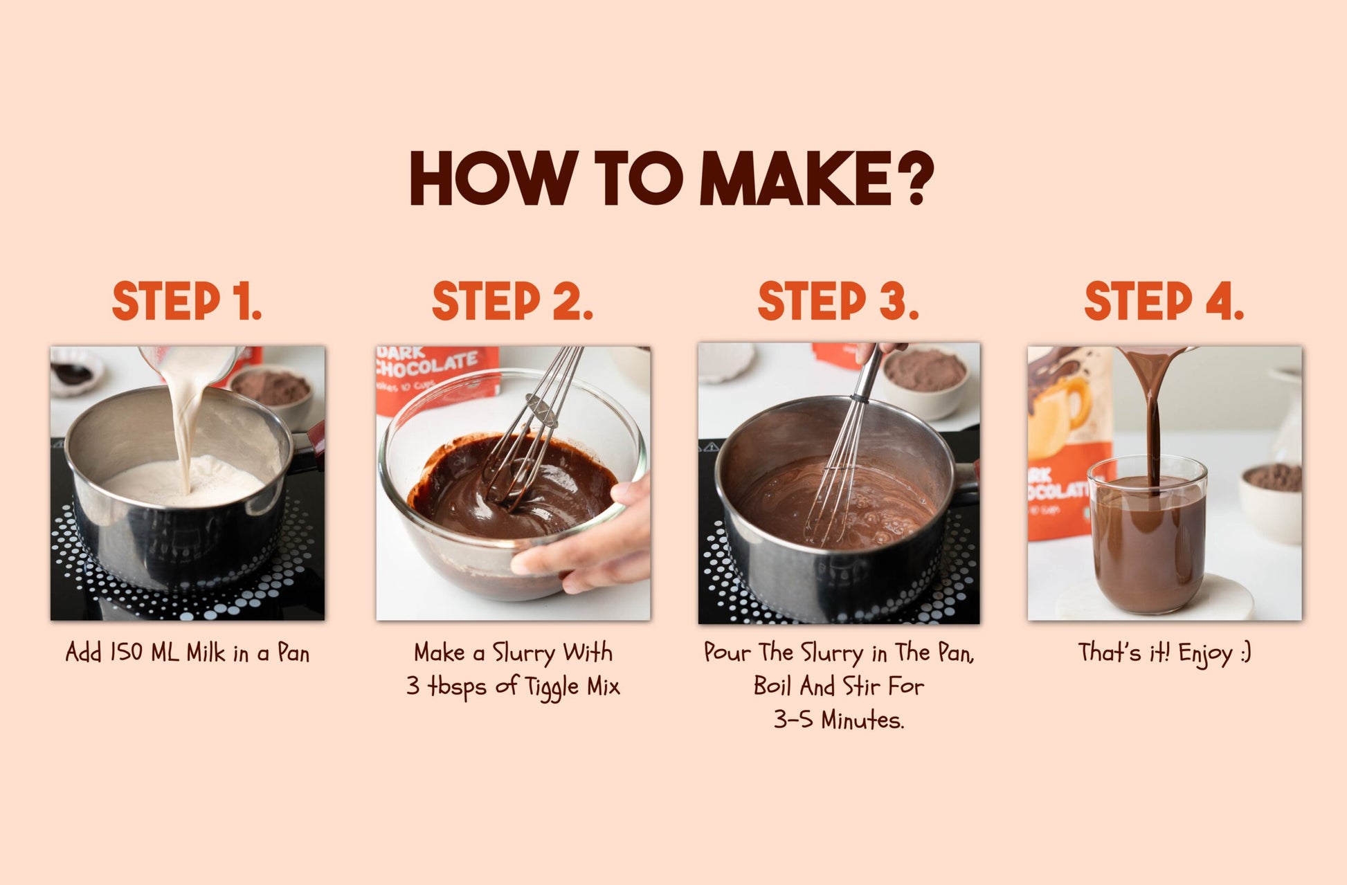 Heat 150-200ml of milk, add 2 tablespoons of Tiggle mix, stir well until dissolved. Works with dairy, almond, oat, or soy milk. Ready in 3 minutes!